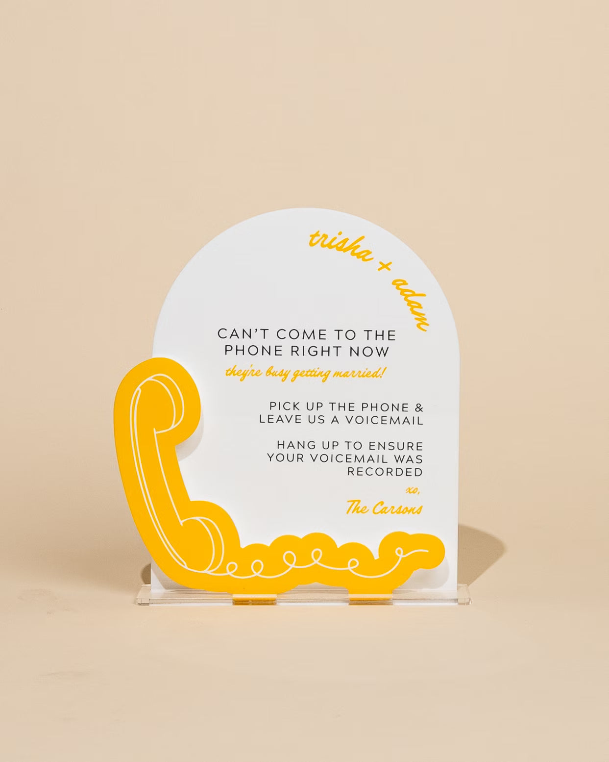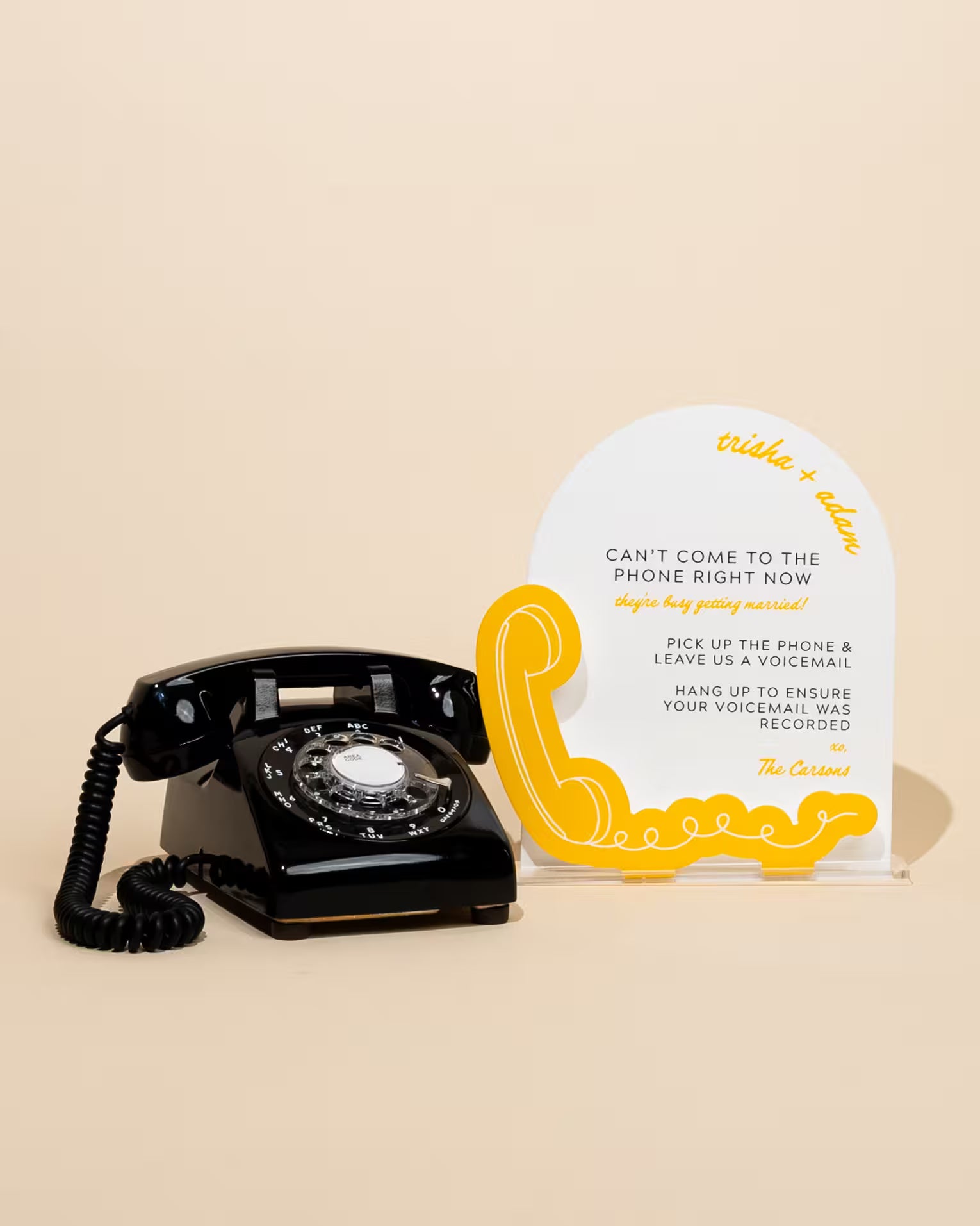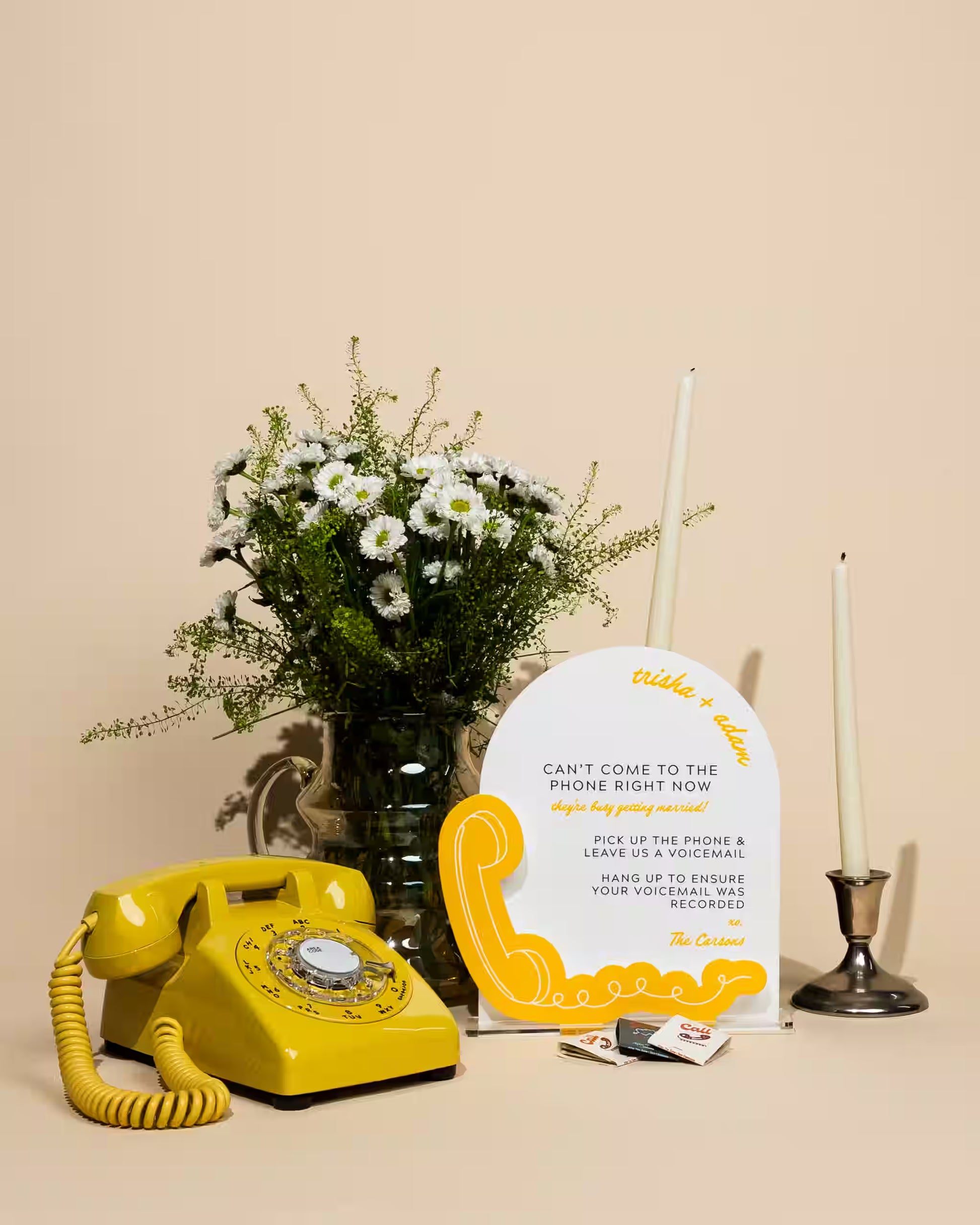 Πείτε Γεια στην Ανάμνηση – Ποιος δεν απολαμβάνει λίγη αγάπη μέσω φωνητικών μηνυμάτων; Αυτό το παιχνιδιάρικο σημάδι αναλαμβάνει την επικοινωνία, ενθαρρύνοντας τους καλεσμένους σας να αφήνουν μηνύματα που θα σας κάνουν να γελάσετε, να κλάψετε και να χαμογελάσετε για χρόνια. Το Έθιμο διατίθεται σε δύο χρωματικούς συνδυασμούς, κίτρινο ή μπλε, και διατηρεί το στιλ ενώ διασφαλίζει ότι καμία ανάμνηση δεν θα μείνει πίσω.